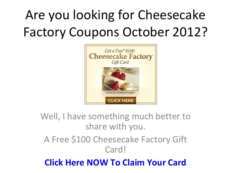 Cheesecake Factory Coupons, Deals, July 2022 - RetailMeNot.com The Cheesecake Factory is reputed for the quality of its dishes such as pastas, pizzas, seafood and is especially known for its 50+ cheesecakes and specialty desserts. It is also famous for its large portions, which customers regard as convenient for sharing or taking home. Cheesecake Factory Coupons: 12 Coupon Codes for May 2022 Show Coupon Code 35% success rate Save 49% Deal Free Slice of Cheesecake with Purchase Details: Free Slice of Cheesecake with Purchase of $25 in Gift Cards. Valid on Traditional Gift Cards and eGift Cards. Redeemable in Restaurants from 12/26/12 - 3/31/13. Expires 12/25/2012 Show The Deal $25 Deal